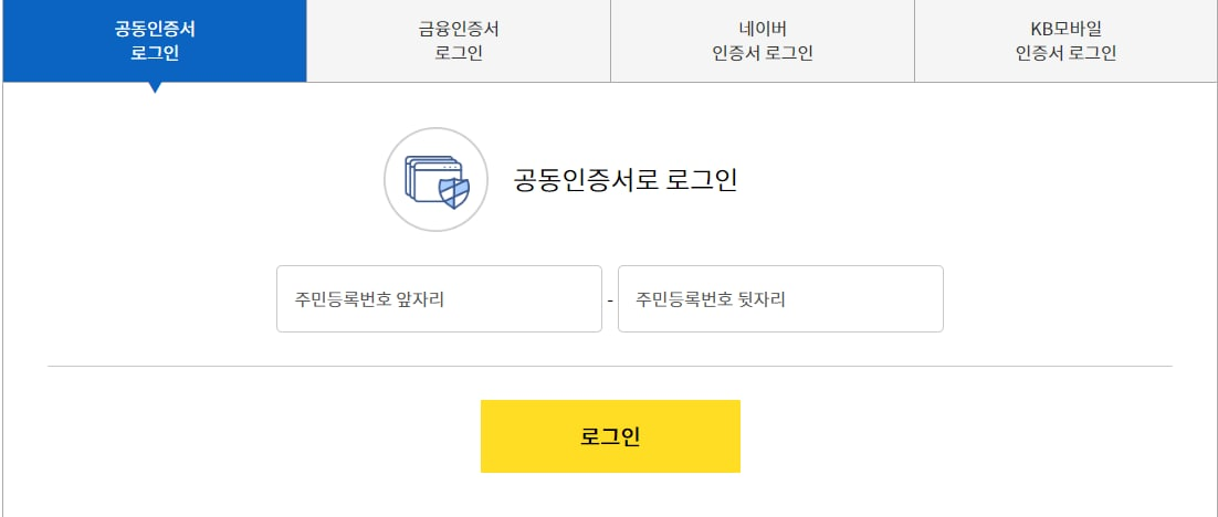 공동인증서, 금융인증서, 네이버 인증서, KB모바일 인증서 4가지 중 편하신 방법으로 로그인해주세요.