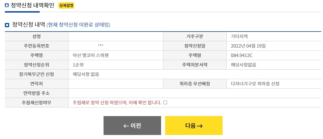 마지막으로 가장 중요한 점은, 지금까지 내가 입력한 청약 신청 정보가 맞는지 확인하는 것입니다. 이름은 잘 맞게 등록되었는지, 주택형은 잘 선택했는지 다시 한 번 확인해주세요.
